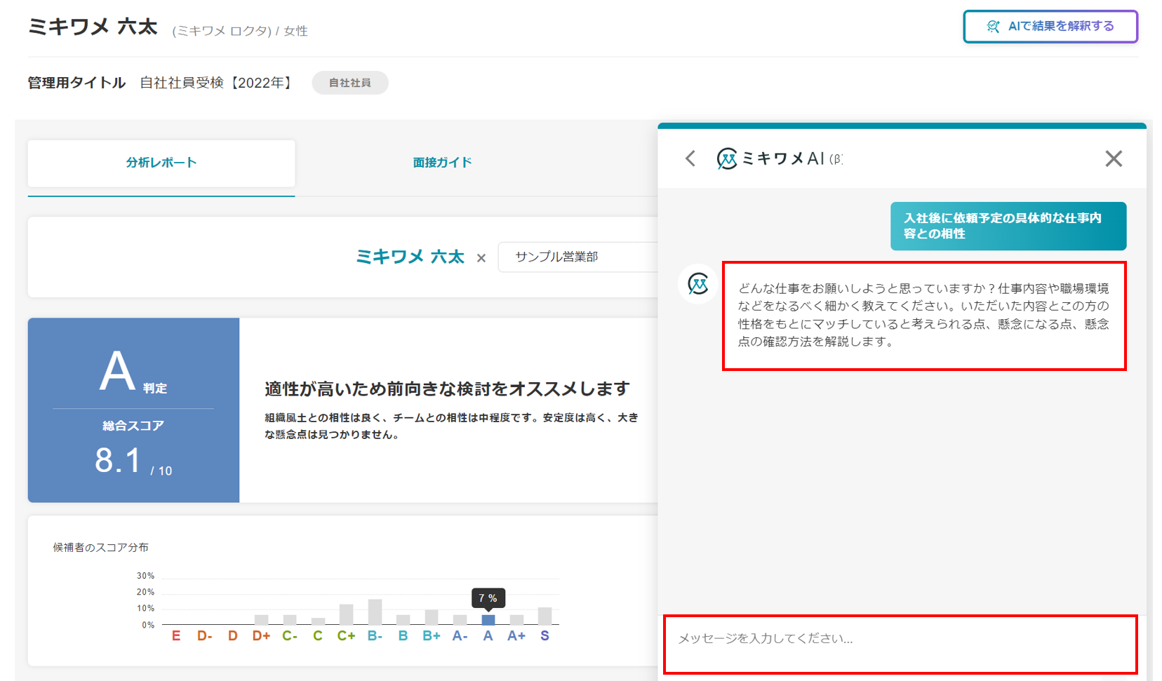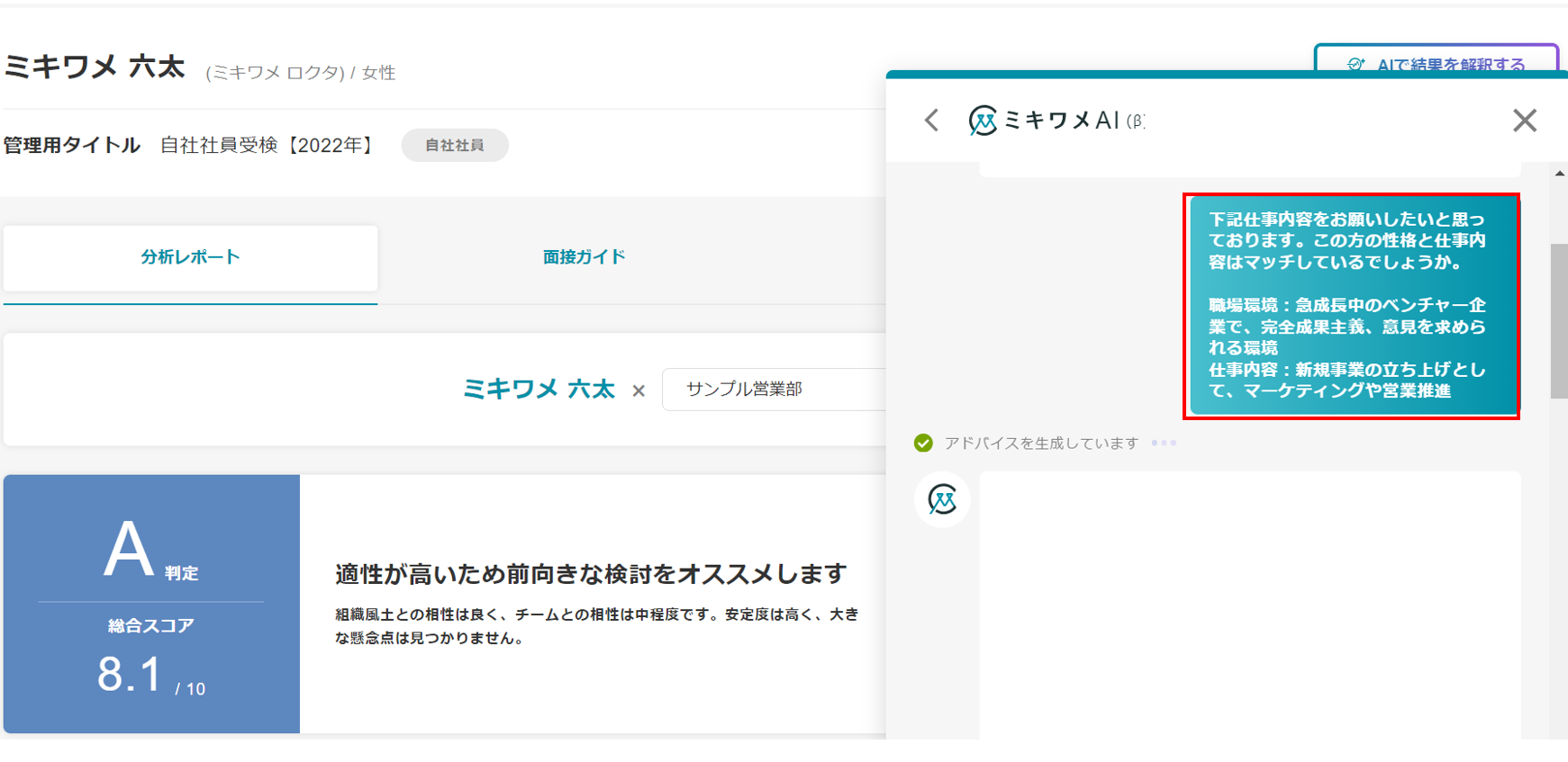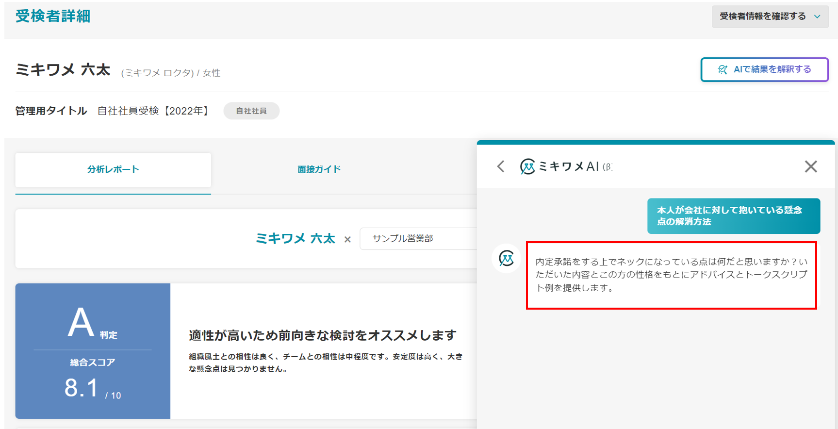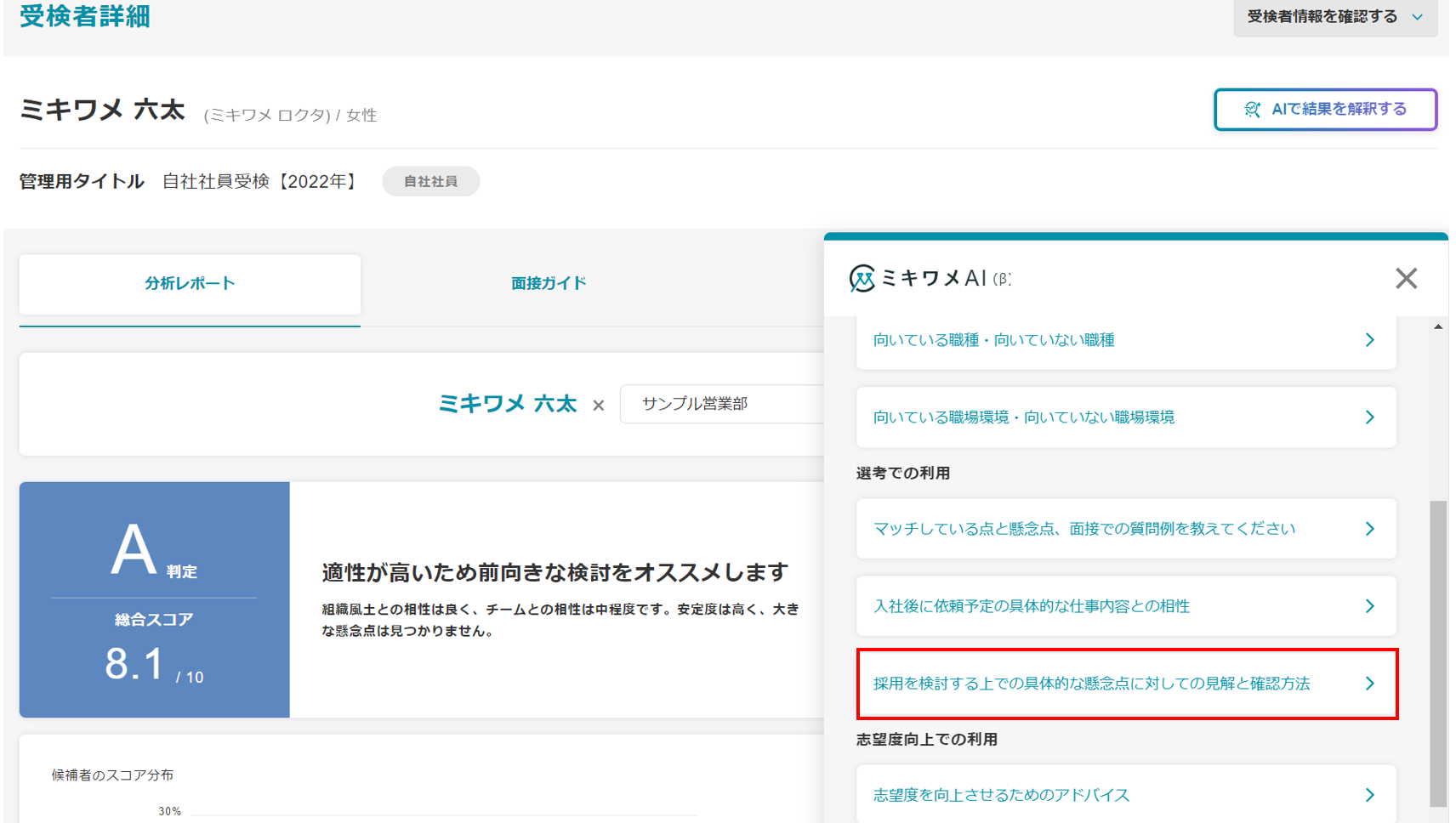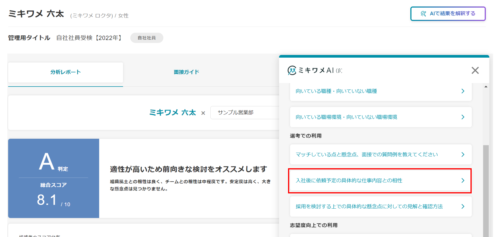 ミキワメAIの詳しい操作方法は(適性検査でミキワメAIを活用する)をご参照ください。
