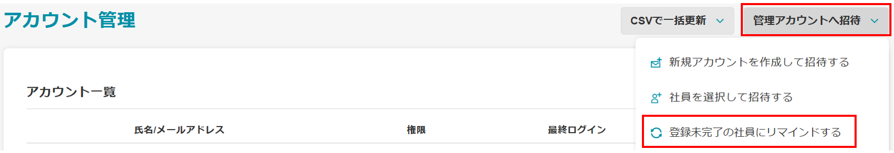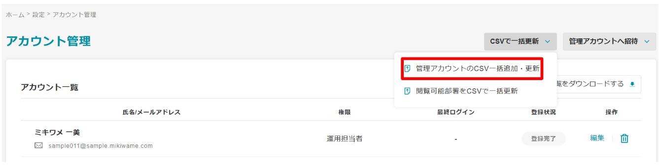 3.右上の「CSVで一括更新」→「管理アカウントのCSVで一括追加・更新」をクリック