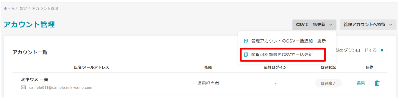 3.右上の「CSVで一括更新」→「閲覧可能部署をCSVで一括更新」をクリック