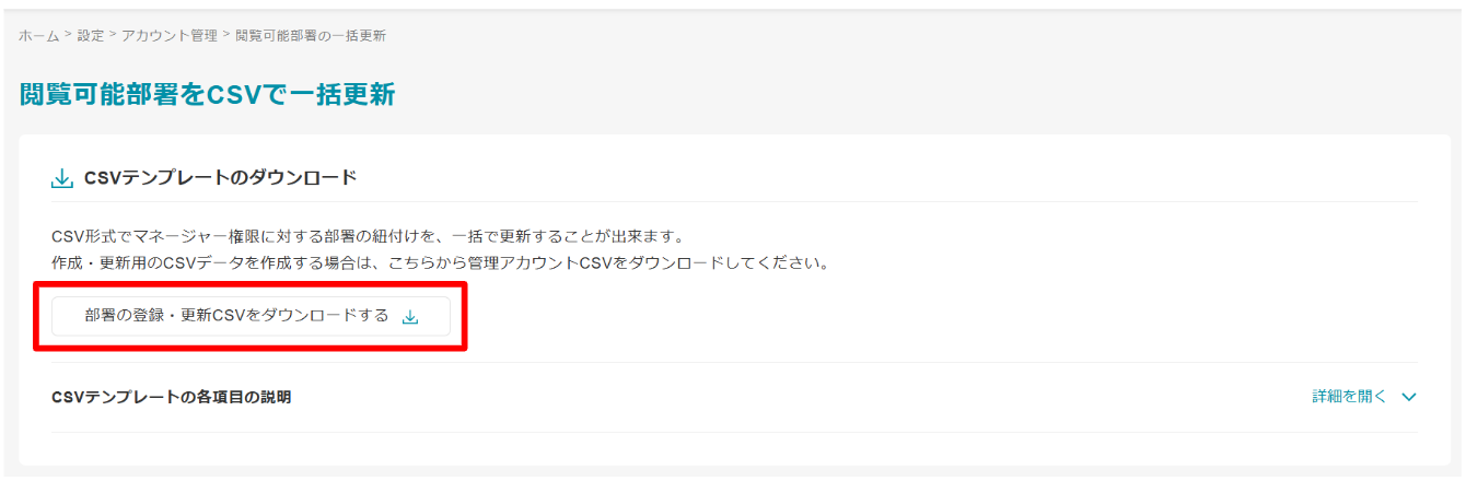 4.「部署の登録・更新CSVをダウンロードする」をクリック