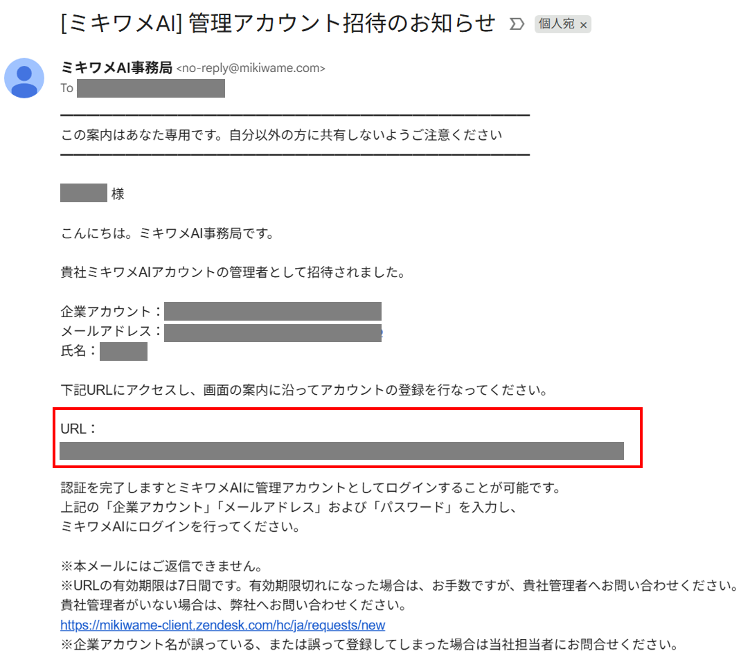 招待メールに記載されたURLの有効期限は7日間です。有効期限切れになった場合は、管理アカウントの登録状況・再発行案内を参照いただきアカウントを削除、再登録してください。