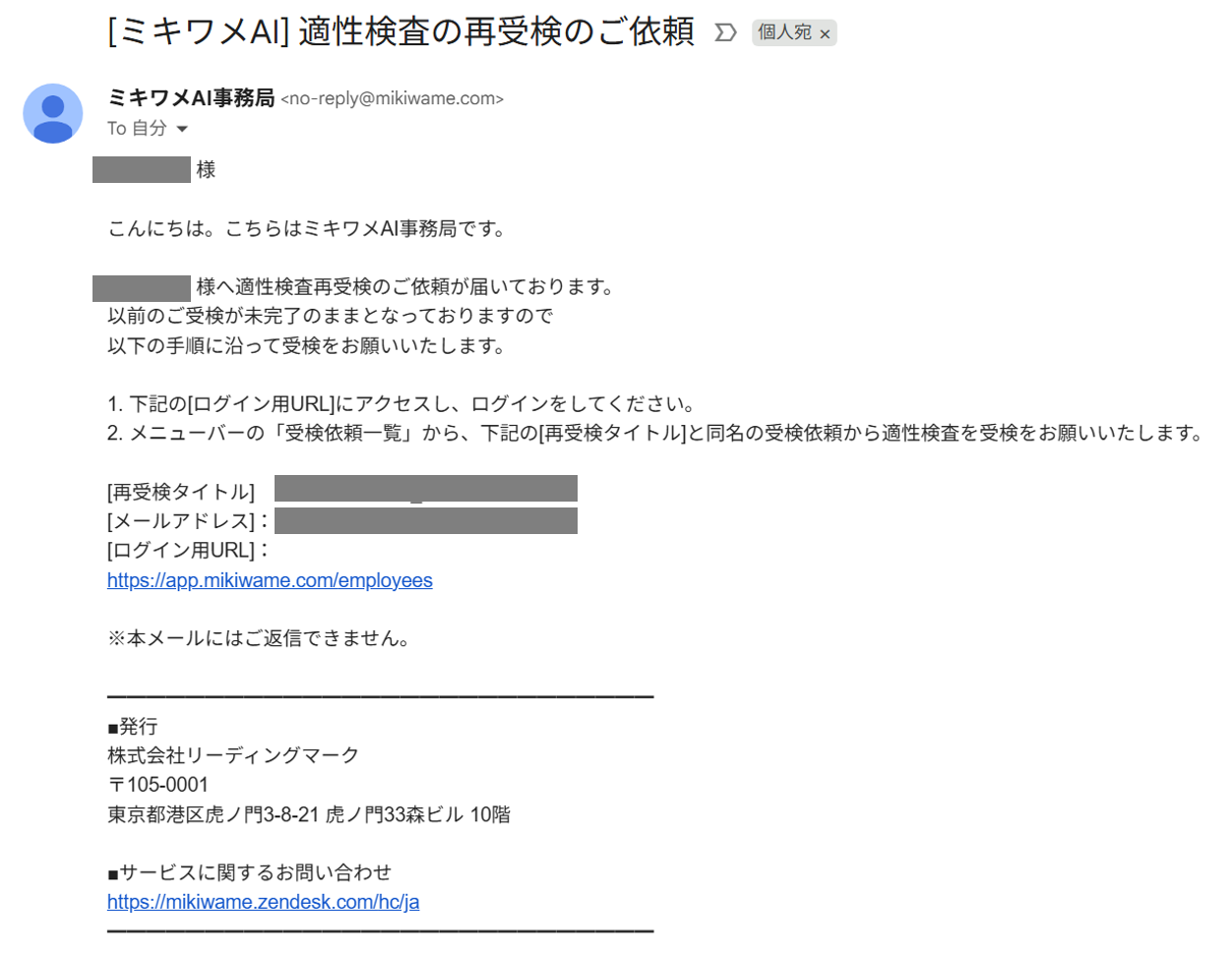 ※受検中断中の方に送られるメール文面は以下の内容