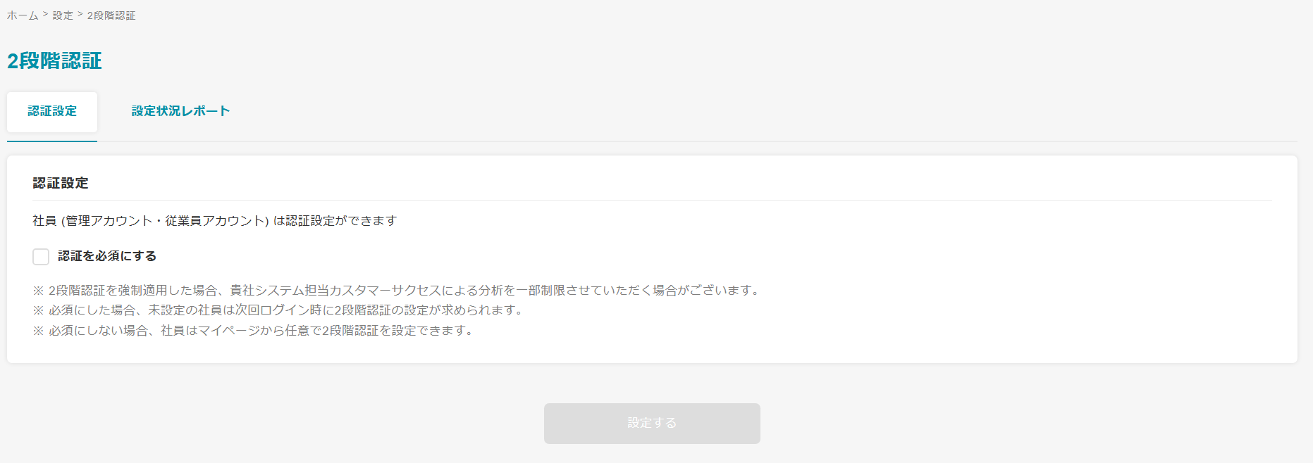 特に管理アカウント・従業員アカウントについては、管理者の設定で必須化が可能です。