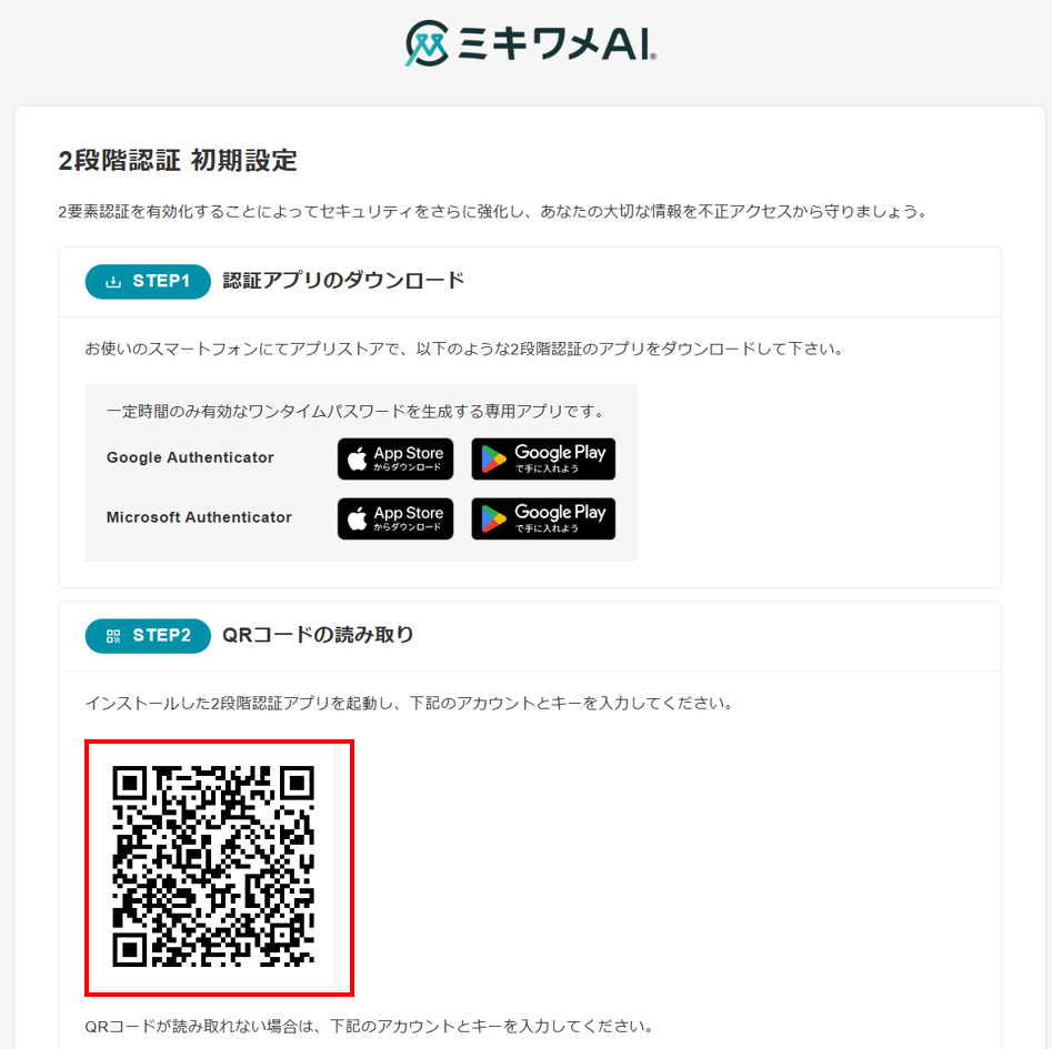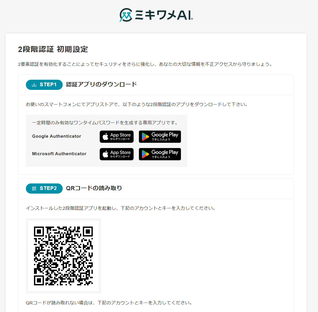 ※ログイン中のユーザーでまだ2段階認証を設定していない方は、その場で2段階認証の設定画面に遷移します