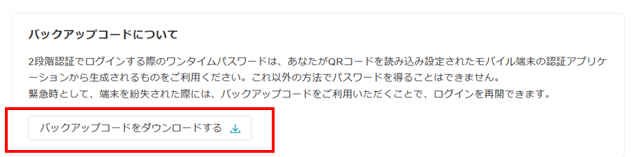 バックアップコードを再発行(再ダウンロード)すると、以前のコードは無効になります。 運用上は、再発行後のバックアップコードを最新として保管してください。